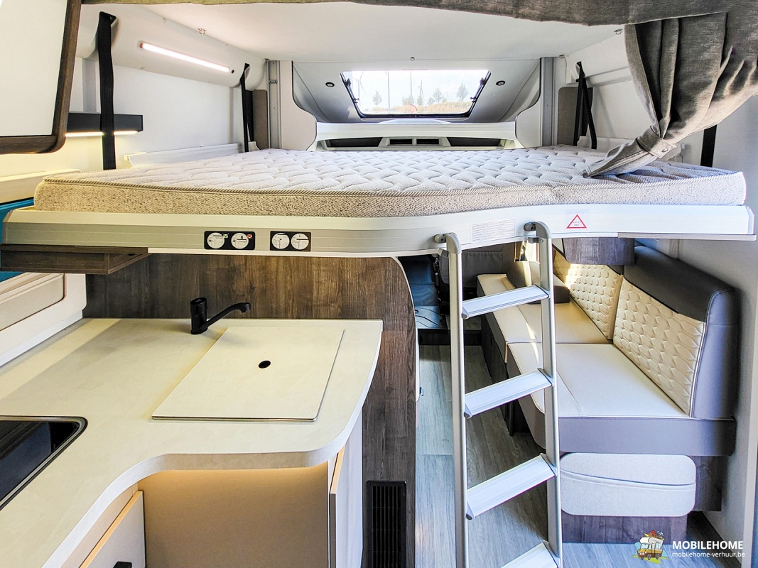 Elektrisch hefbed boven zithoek, Insectendeur, Moduleerbare L-zithoek, Centrale tafelvoet (telescopisch), Zuinige LED interieurverlichting, Automatische koelkast AES 160L, Apart vriesvak, Ruime garage, Extra diepe garagebodem, LED buitenverlichting, In de hoogte verstelbare cabinezetels, 5 gehomologeerde zit-en slaapplaatsen, GPS, fietsenrek (4 fietsen), zonneluifel